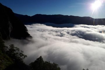 鳳凰三山の稜線から朝陽が昇り岩壁を赤く染める。 見上げる空は青さを増し…