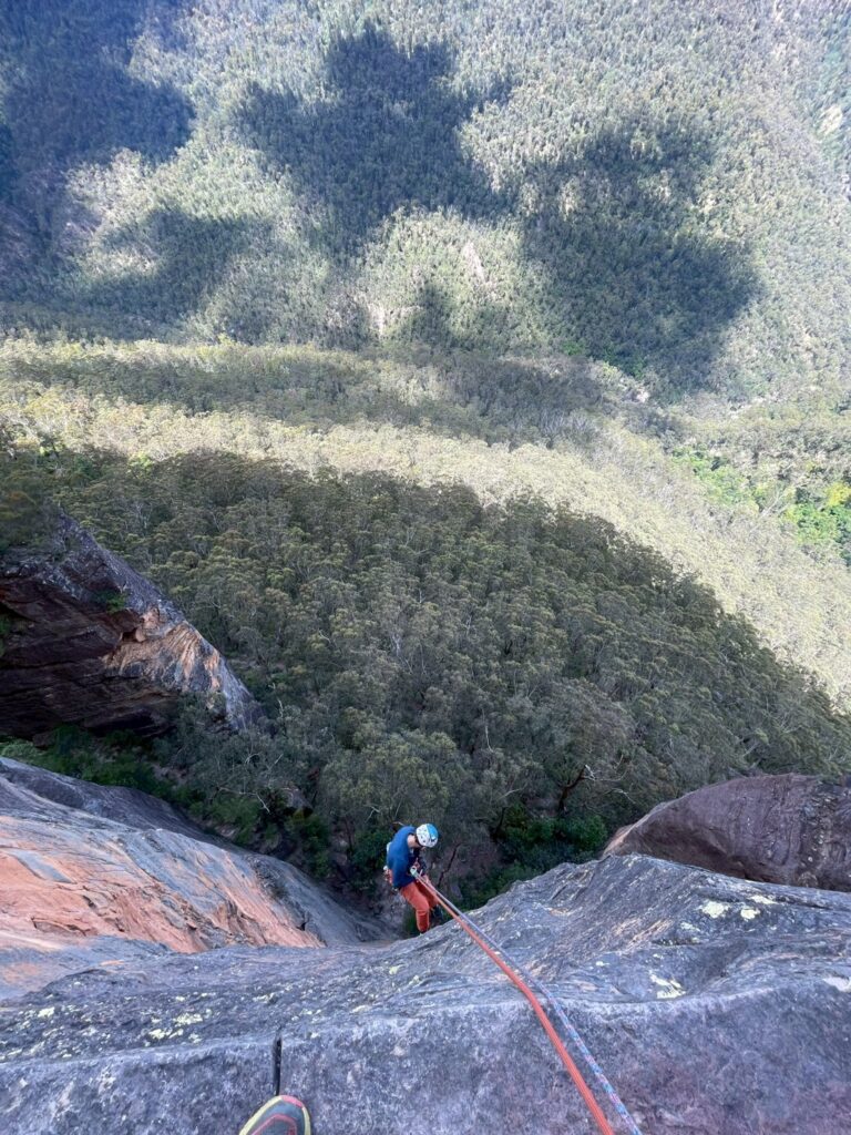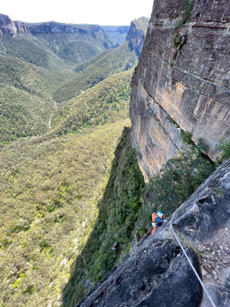 底の見えない谷に向かって45m×2回の懸垂でアプローチ