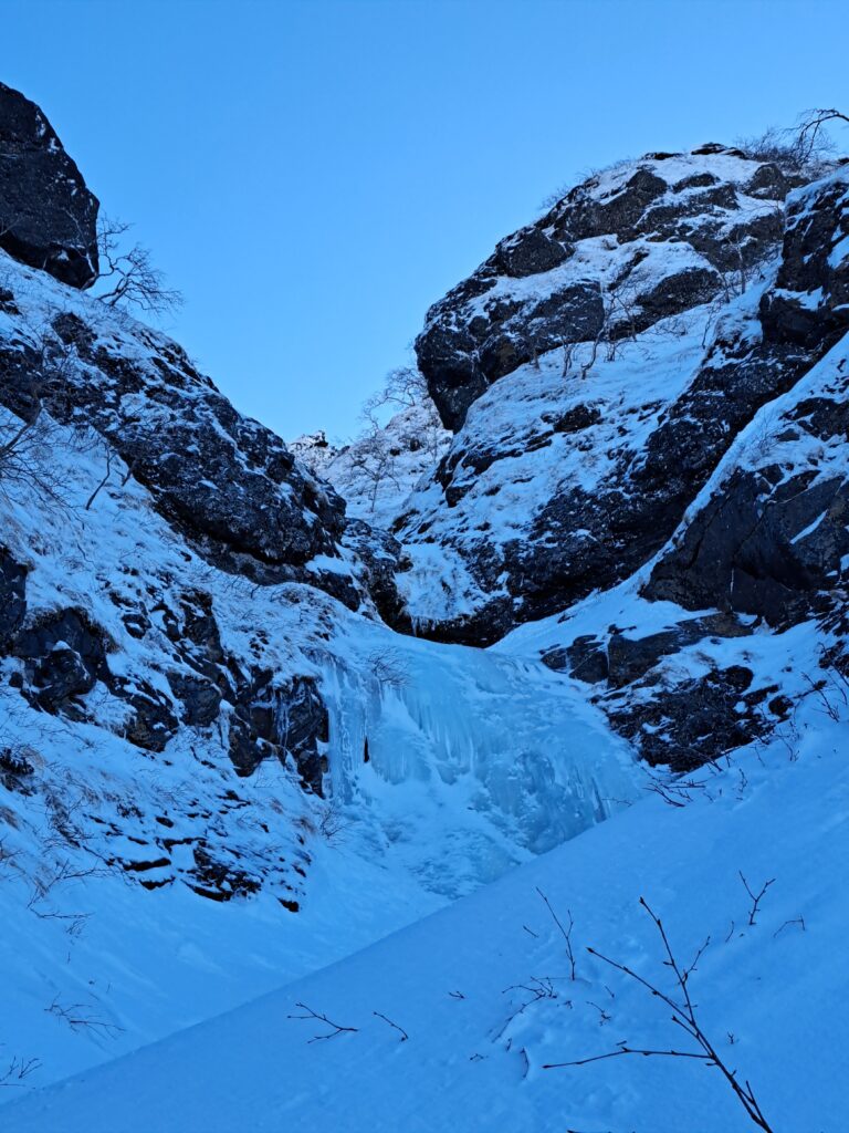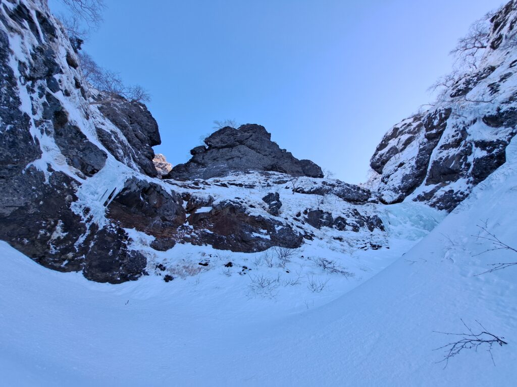 写真から分かるようにゴルジュの上部は明るく開けているが降雪直後などは雪崩には要注意である