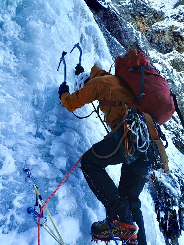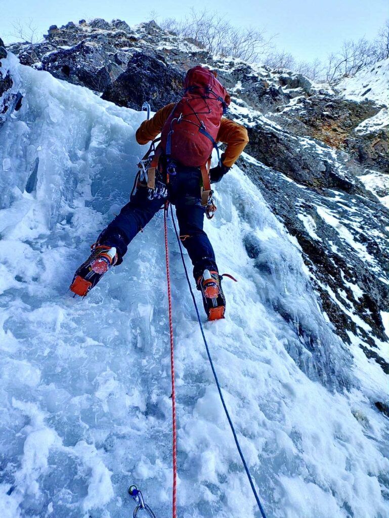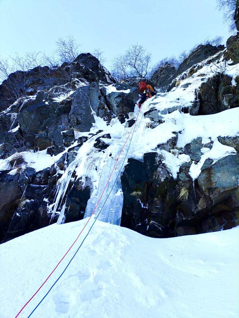 右俣は易しい氷から岩の露出した滝を越える