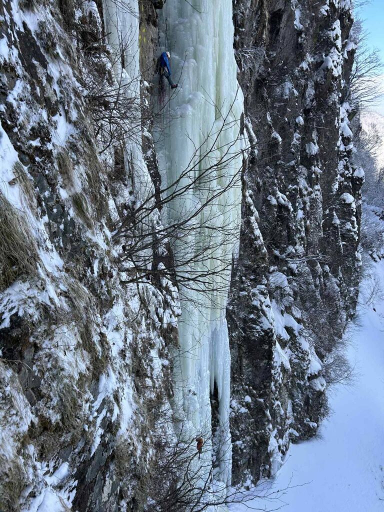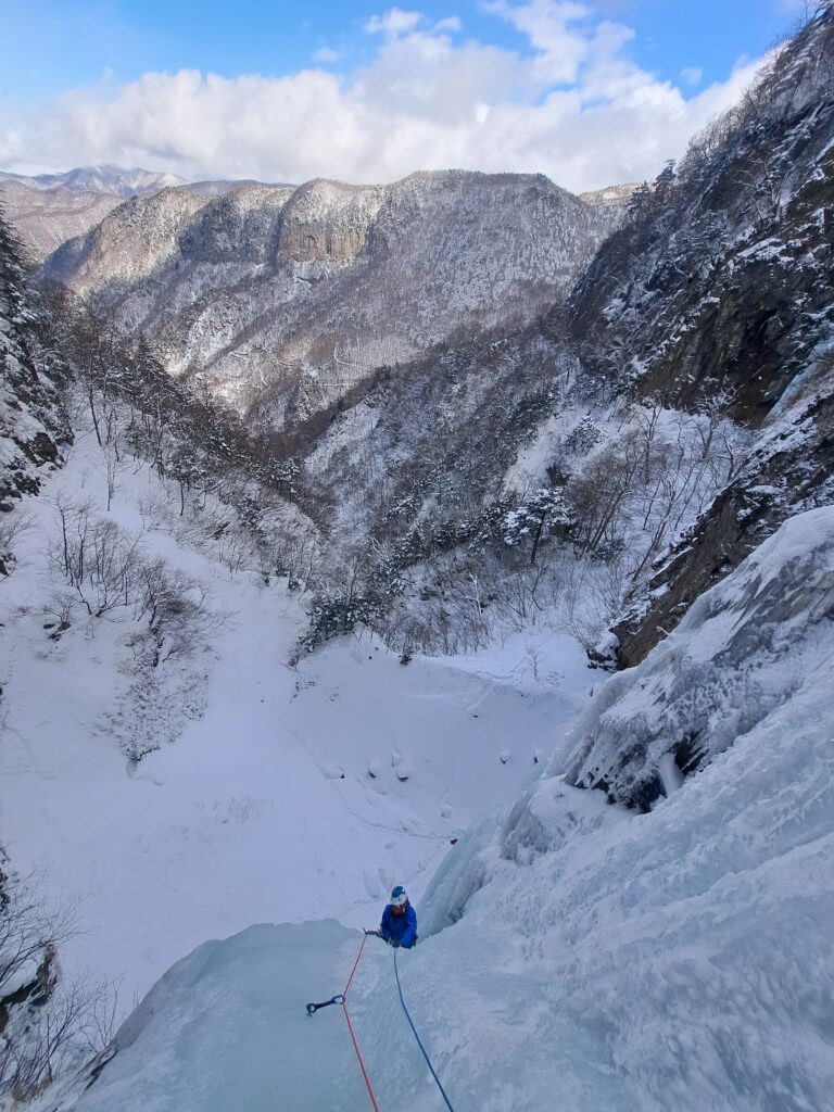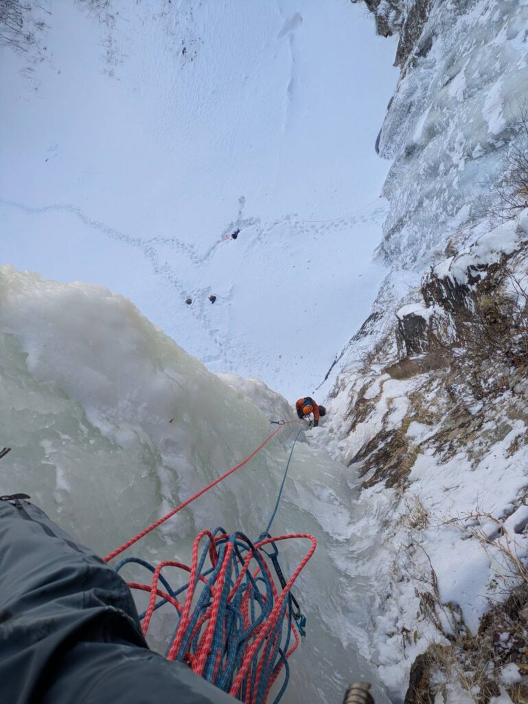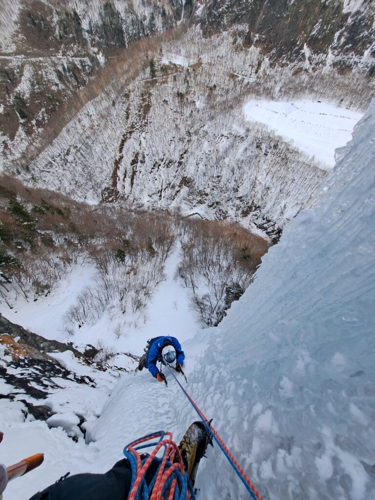 最後の氷柱はか細い氷柱でプロテクションが取れなさそうに見えたので一度、短くピッチを切る