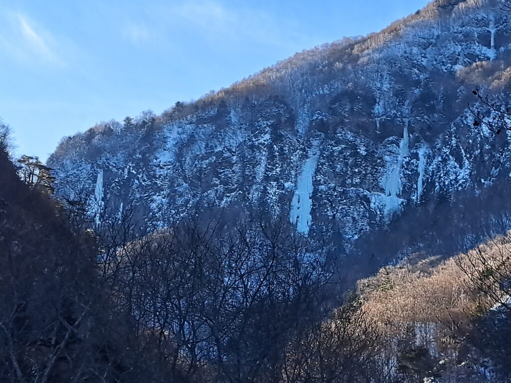 林道を歩き下り坂を降りきるころ、正面の山肌に氷瀑が現れる