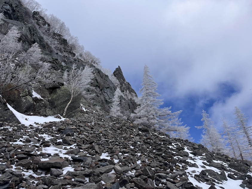 稲子岳の壁は人気のある南壁・左カンテを除いて記録は少ない