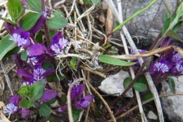 石灰岩の岩壁に身を寄せ合うように咲く紫の花を見つけました。 名前は「ヒ…