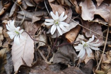 厚く積もった褐色の落ち葉の上。 目を凝してようやく、ひっそりと咲くミス…